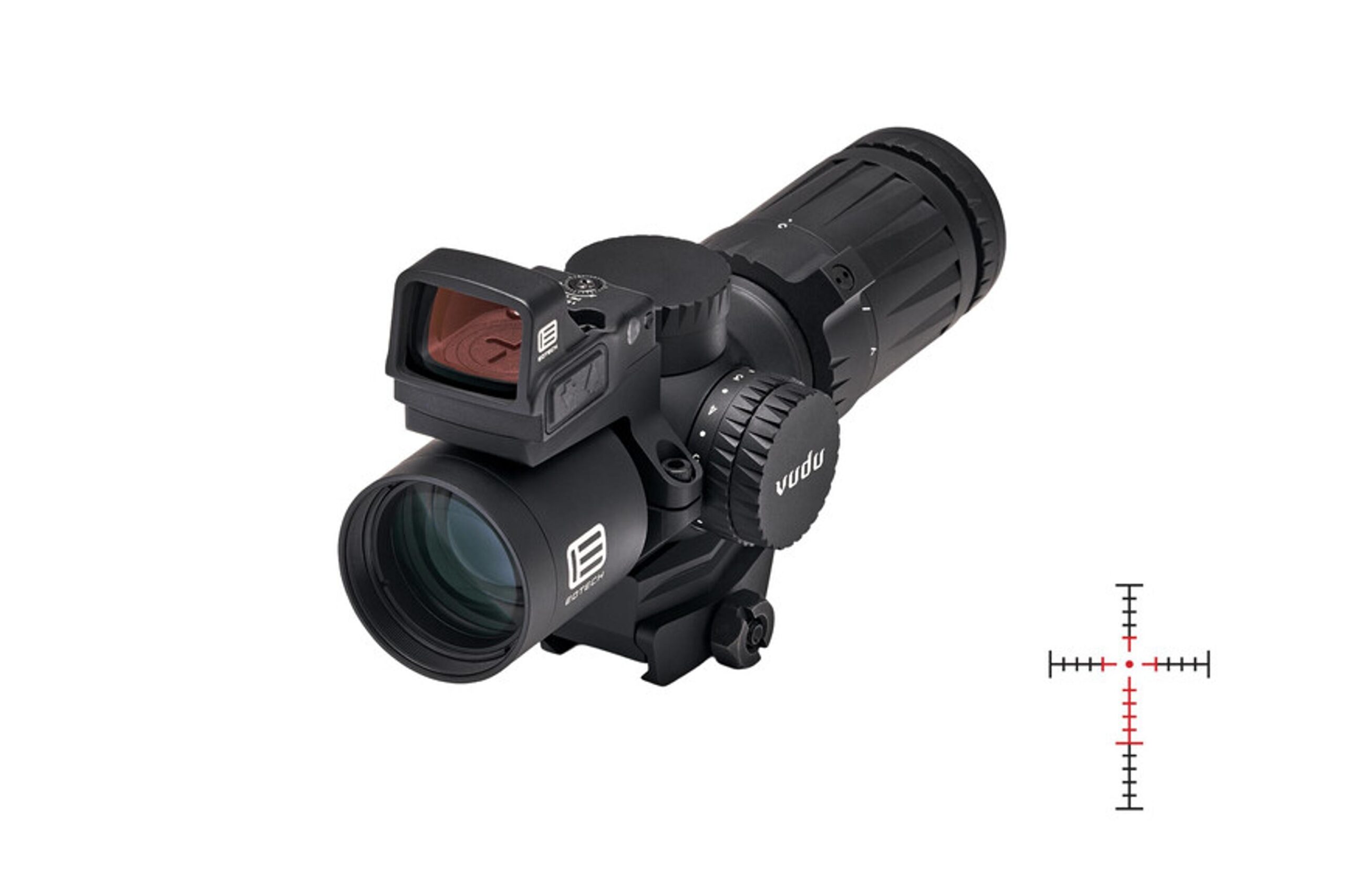Приціл EOTech Vudu 3–9×32 оснащений сіткою HC1 у другій фокальній площині, яка розрахована на точну стрілянину за цілями на середніх дистанціях. Непідсвічене перехрестя допомагає стрілці враховувати падіння траєкторії та бічний вітер, а центральна точка прицілювання розміром 3,6 МОА при 3-кратному збільшенні та 1,2 МОА при 9-кратному забезпечує граничну точність. При необхідності можна використовувати підсвічування з 10 рівнями яскравості, яке живиться від батареї CR2032 та працює до 300 годин. Якісне покриття антивідблиску лінз гарантує яскраве і контрастне зображення навіть за складних умов освітлення.