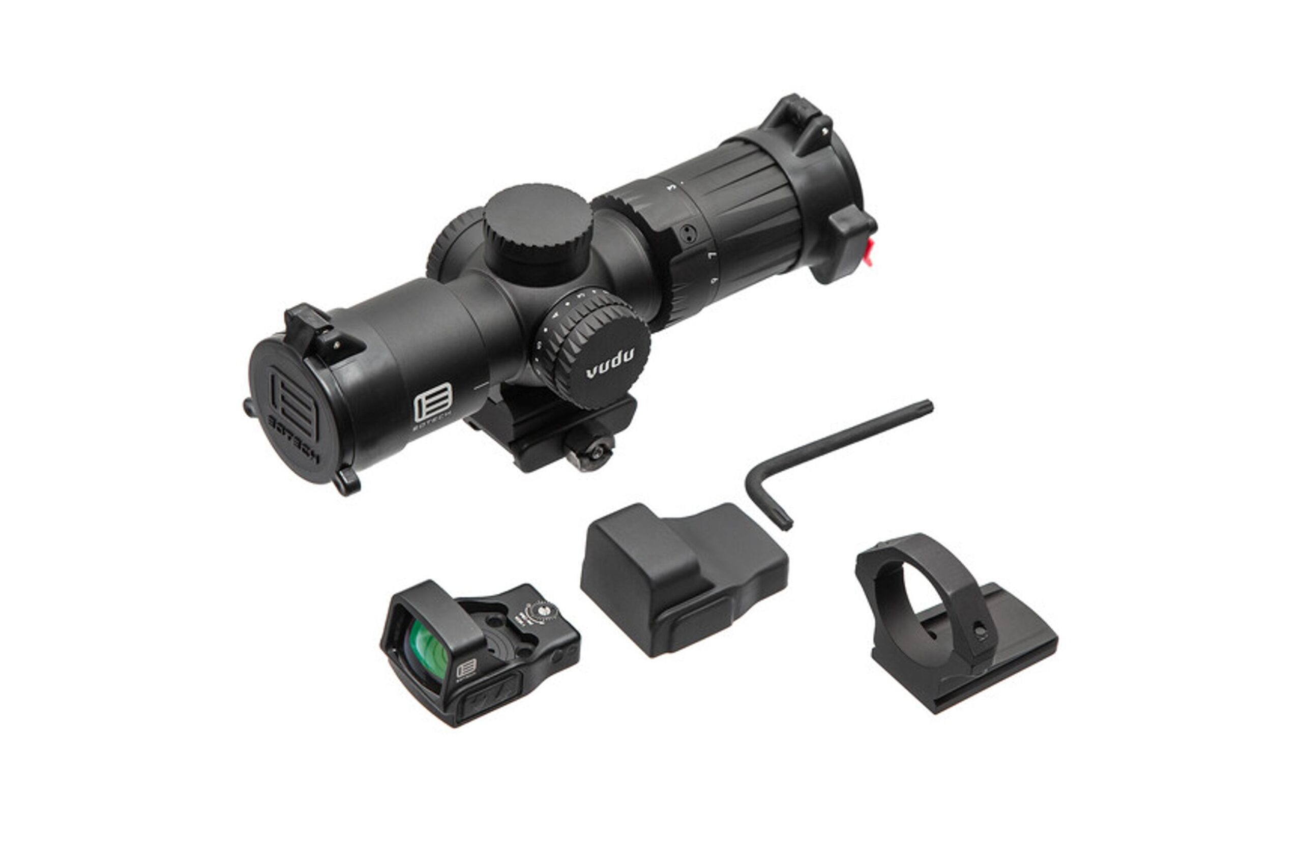 EOTech VDU3-9PKG1 – комплект, створений для стрільців, які цінують швидкість, точність та надійність. Він поєднує оптичний приціл Vudu 3-9×32 і приціл коліматора EFLX 3 МОА з кільцевим кріпленням, яке дозволяє встановлювати коліматор зверху або під кутом 45°. Таке рішення робить комплект універсальним інструментом для впевненої стрільби на середніх та ближніх дистанціях, забезпечуючи плавний перехід між цілями та високу ефективність у динамічних ситуаціях.