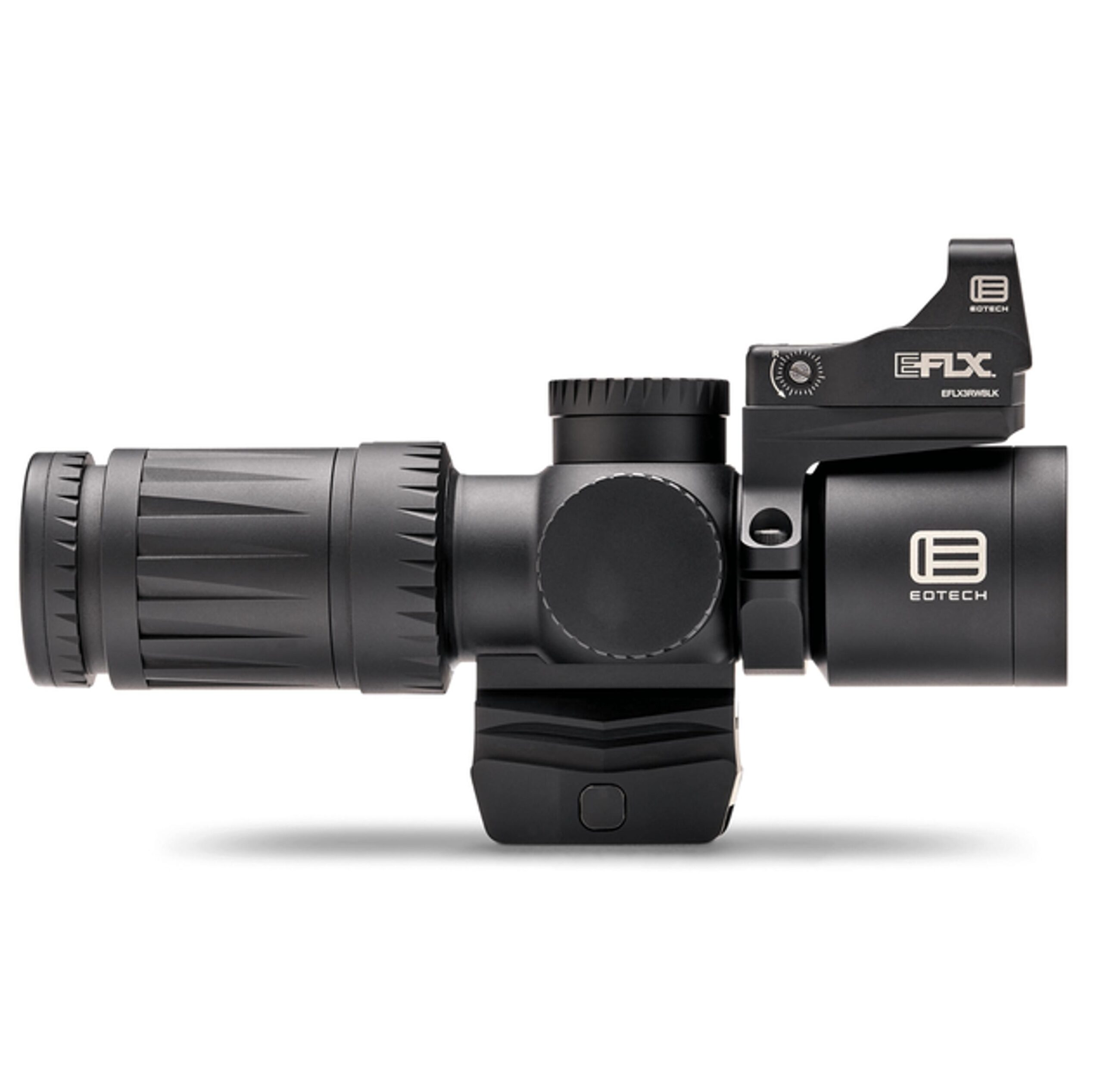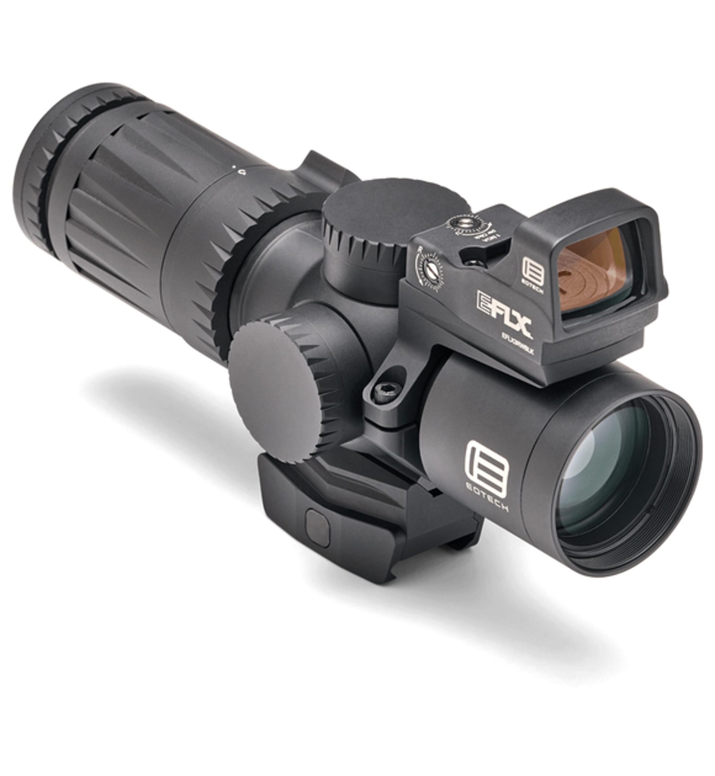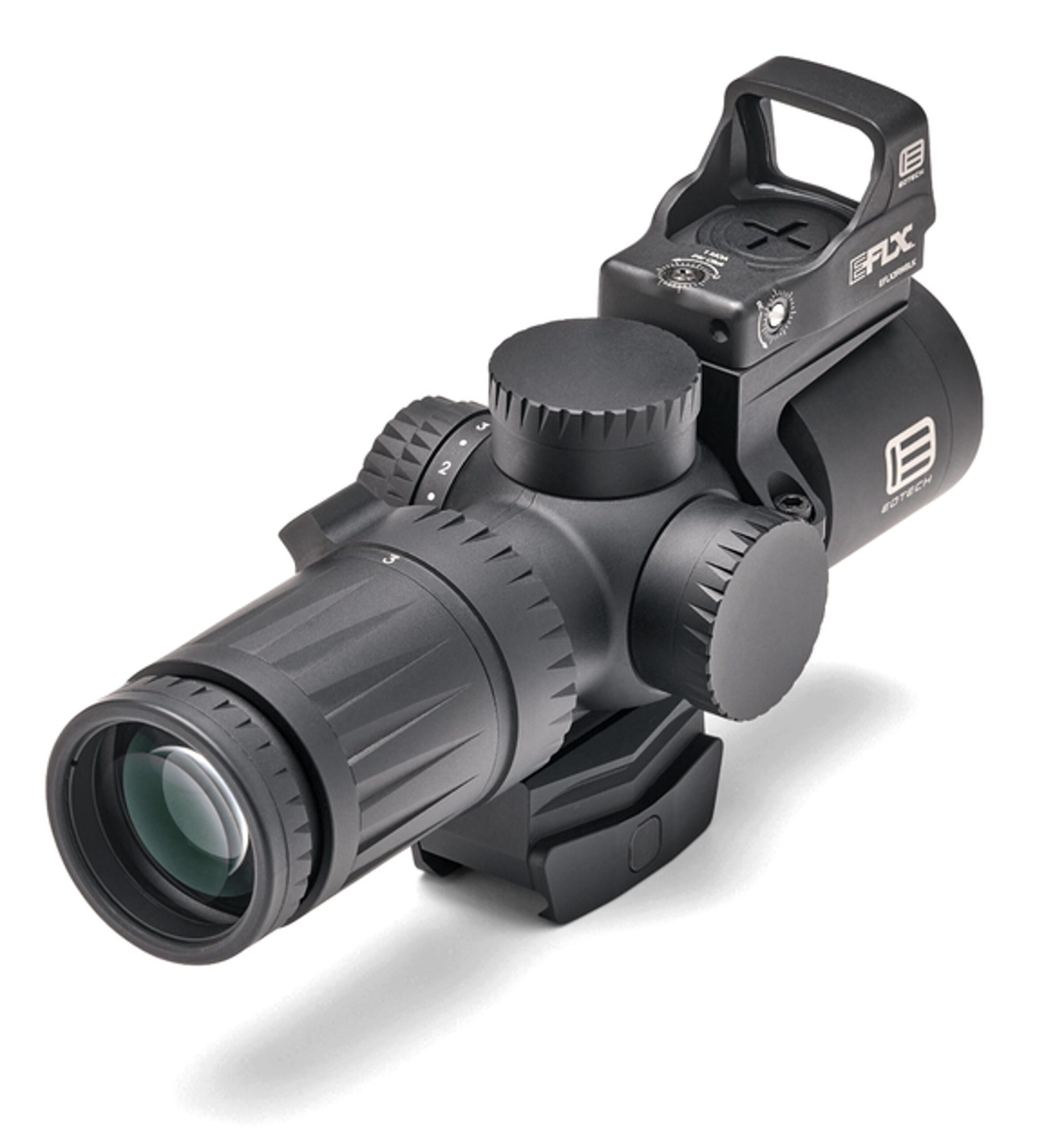 Приціл коліматора EOTech EFLX 3 МОА, що входить в комплект, розроблений для блискавичного захоплення мети. Його прямокутне вікно забезпечує широке поле зору, а високотехнологічне скло передньої лінзи унеможливлює спотворення. Приціл має вісім рівнів яскравості для денного світла та один режим, сумісний із приладами нічного бачення. Від однієї батареї CR2032 пристрій працює до 25 000 годин. Відсік для батареї, розміщений зверху, дозволяє міняти її без демонтажу прицілу. Корпус із міцного алюмінію забезпечує довговічність, а футпринт типу Leupold Delta Point Pro робить приціл сумісним із популярними платформами. Габарити 47×30,5×25,4 мм і вага 35 г роблять його легким та непомітним при встановленні.